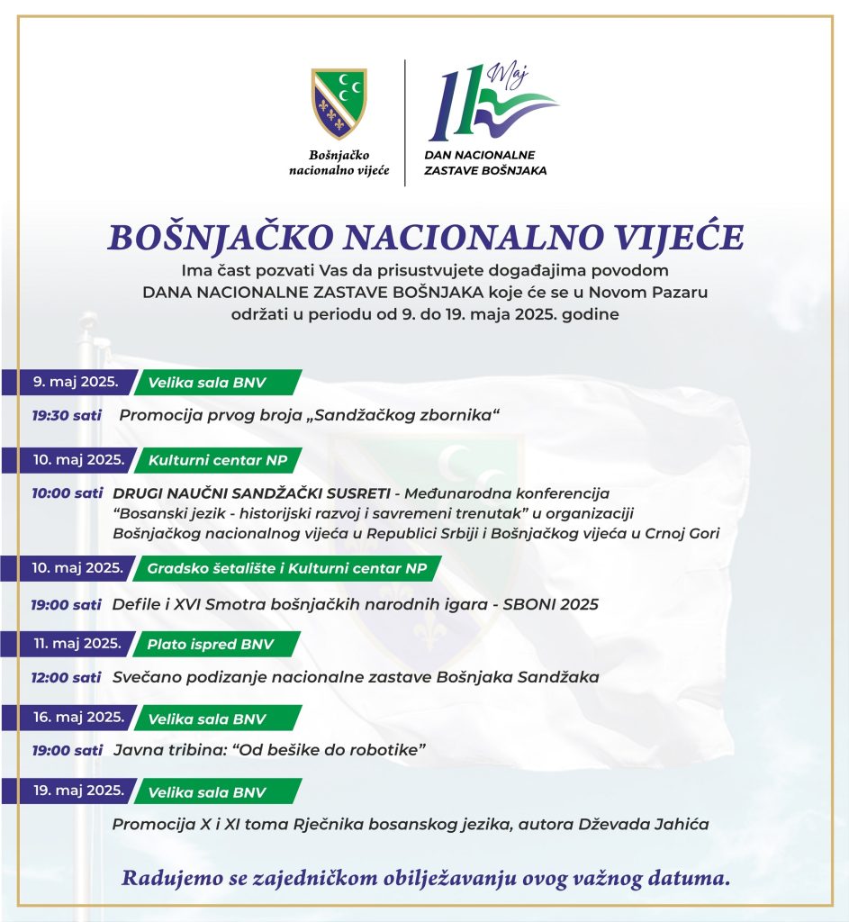 “Program počinje 9. maja promocijom prvog broja Sandžačkog zbornika, a već 10. maja sledi Drugi Naučni sandžački susreti i 16. Smotra bošnjačkih narodnih igara – SBONI 2025. Centralni događaj biće svečano podizanje bošnjačke nacionalne zastave 11. maja, u 12 časova ispred sedišta BNV-a“, rekao je Đekić.